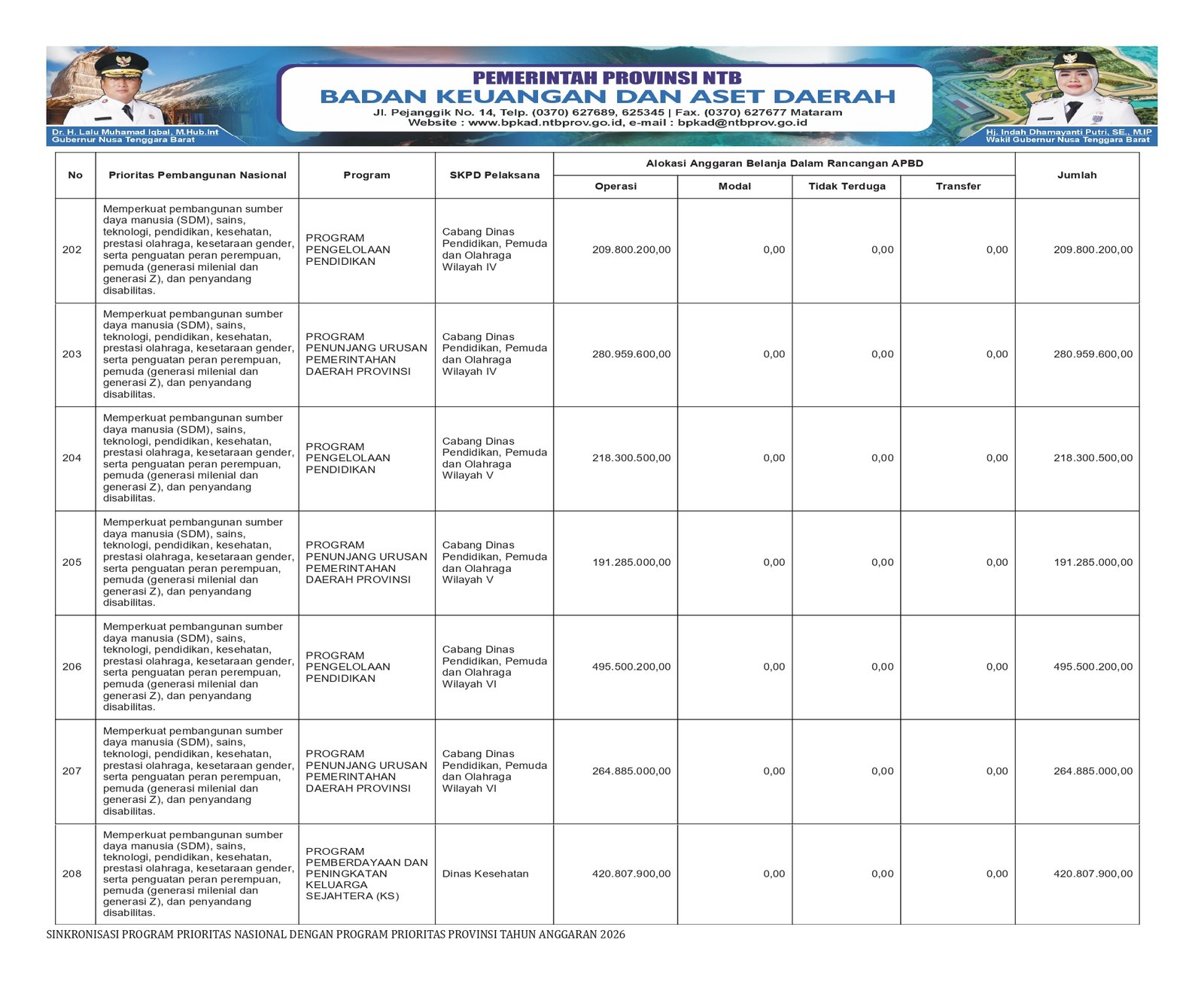 Kebijakan sinkronisasi program prioritas nasional dengan program prioritas provinsi NTB tahun anggaran 2026 meliputi sejumlah program. Diantaranya program pengelolaan pendidikan, program penunjang urusan pemerintahan daerah provinsi, program pemberdayaan dan peningkatan keluarga sejahtera dan lain sebagainya.(*)