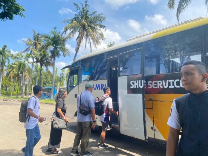 Usai registrasi, penonton menunggu giliran naik bus sesuai warna gelang yang telah dibagikan. Warna gelang ini menjadi penanda kelompok keberangkatan agar proses naik bus berjalan lebih teratur.