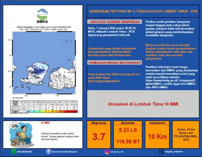 Mataram (globalfmlombok.com) – Gempa bumi tektonik berkekuatan M 3,7 mengguncang wilayah Lombok Timur, pada Rabu, 7 Januari 2026, pukul 18.28 Wita.