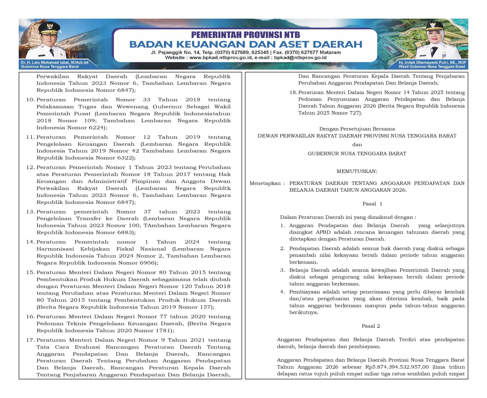 Dalam bagian menimbang dan mengingat, Perda APBD NTB 2026 merujuk antara lain pada:
