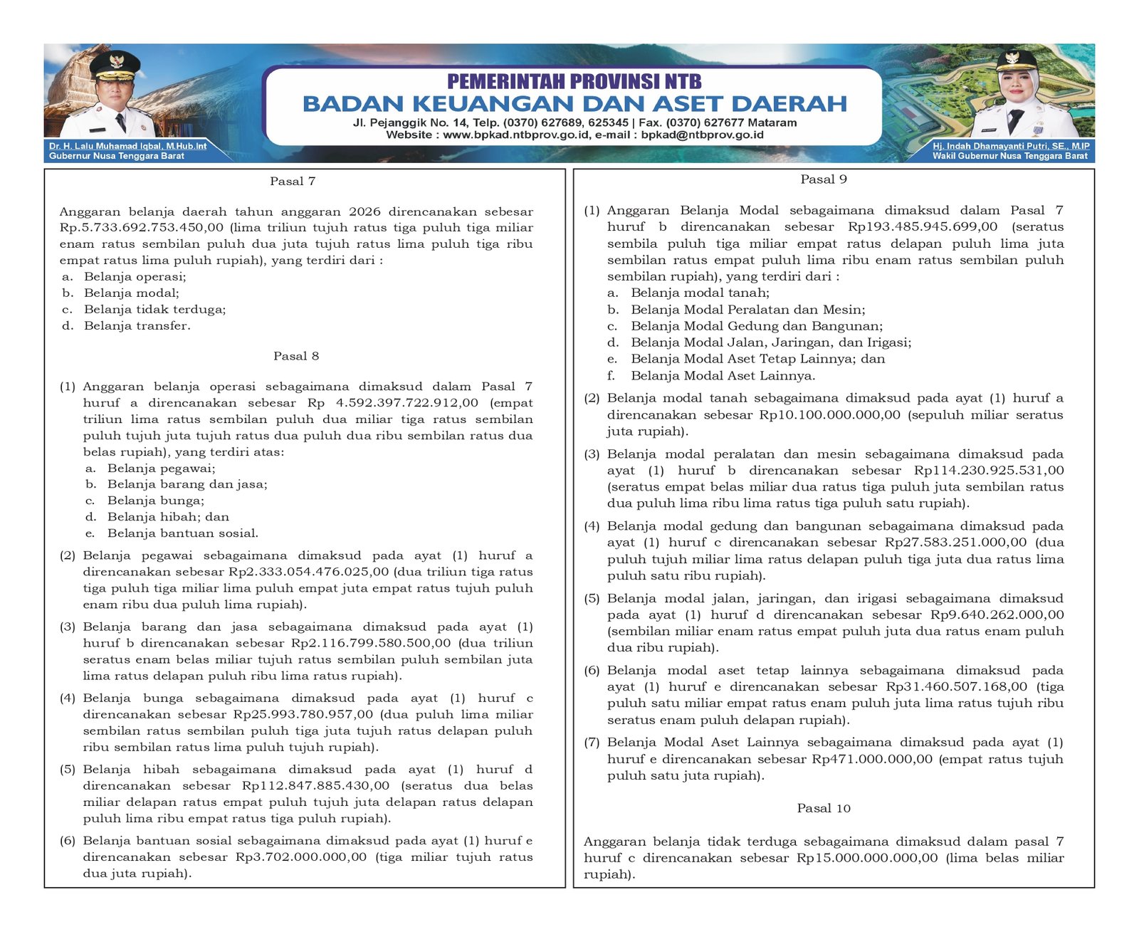 Pemerintah daerah telah menetapkan arah kebijakan belanja dalam Anggaran Pendapatan dan Belanja Daerah (APBD) Tahun Anggaran 2026 dengan total alokasi mencapai Rp5,73 triliun. Ketentuan ini diatur dalam Pasal 7, yang menyebutkan bahwa anggaran belanja daerah direncanakan sebesar Rp5.733.692.753.450.