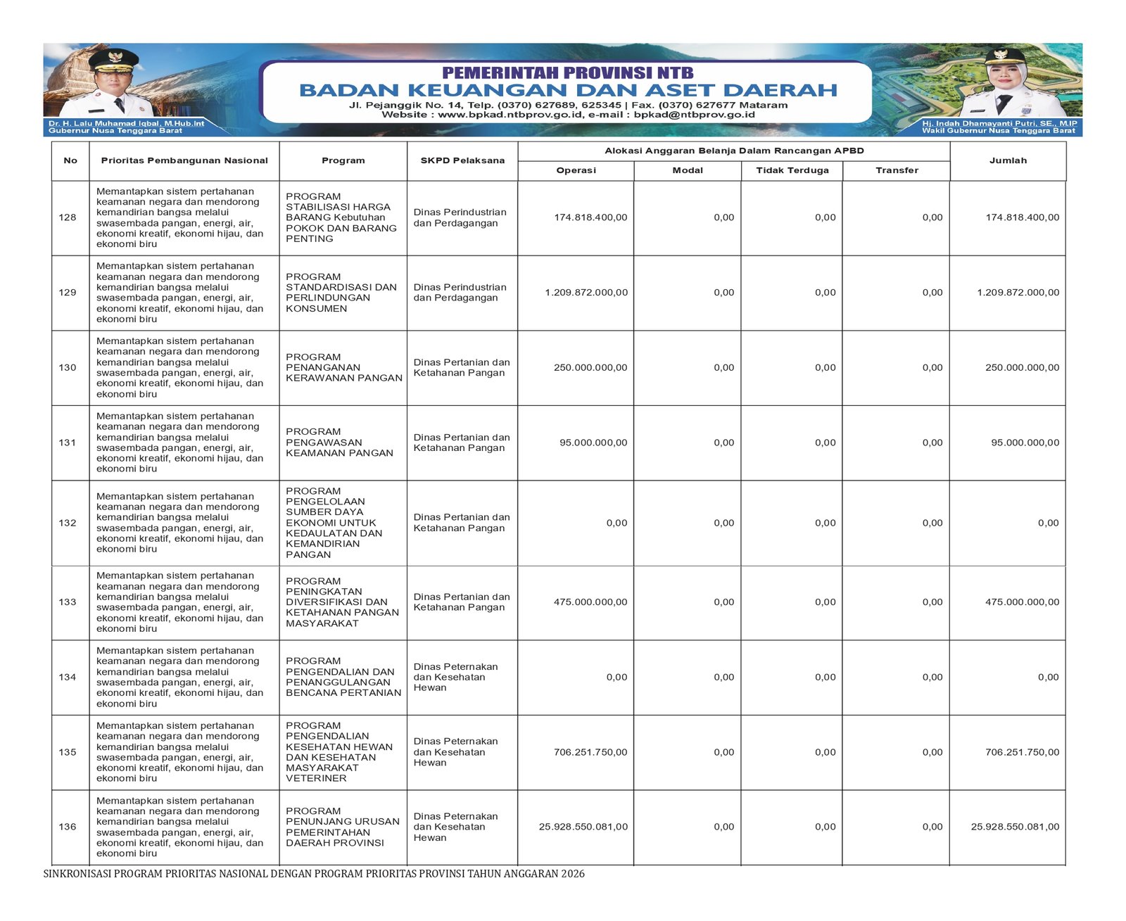 Kegiatan Sinkronisasi Program Prioritas Nasional dengan Program Prioritas Provinsi NTB Tahun Anggaran 2026 diantaranya program stabilisasi harga barang kebutuhan pokok dan barang penting, program standardisasi dan perlindungan konsumen, program penanganan kerawanan pangan dan lain sebagainya.(*)