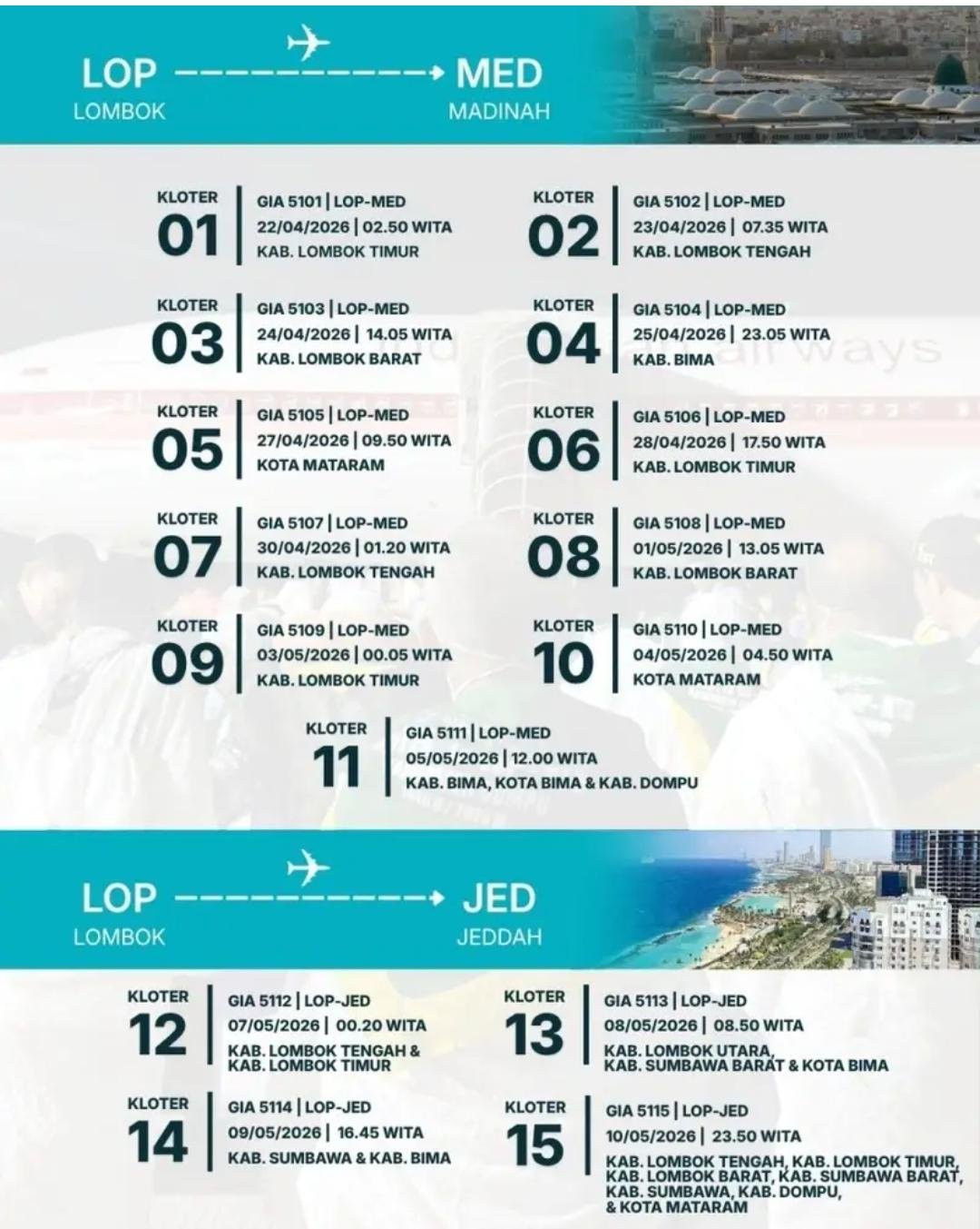 Sementara itu, dari Lombok Timur, sebanyak 1.406 JCH akan diberangkatkan tahun ini. Kloter pertama berjumlah 378 jemaah dilepas oleh Bupati Lombok Timur, Haerul Warisin, di Masjid Agung Al-Mujahidin Selong, Selasa (21/4/2026) dini hari.