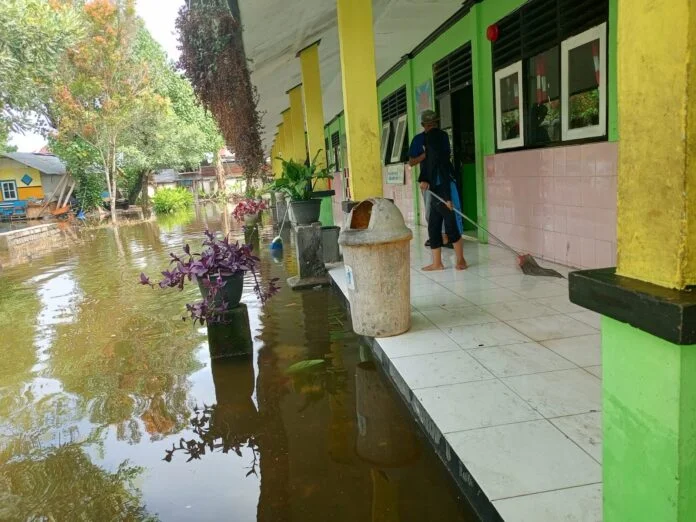 Ia menjelaskan, pada Selasa pagi air sempat masuk hingga teras kelas, meski belum sampai menggenangi ruang belajar. Namun, genangan air tidak kunjung surut dan terus meluas akibat aliran air yang kembali masuk dari area rawa.
