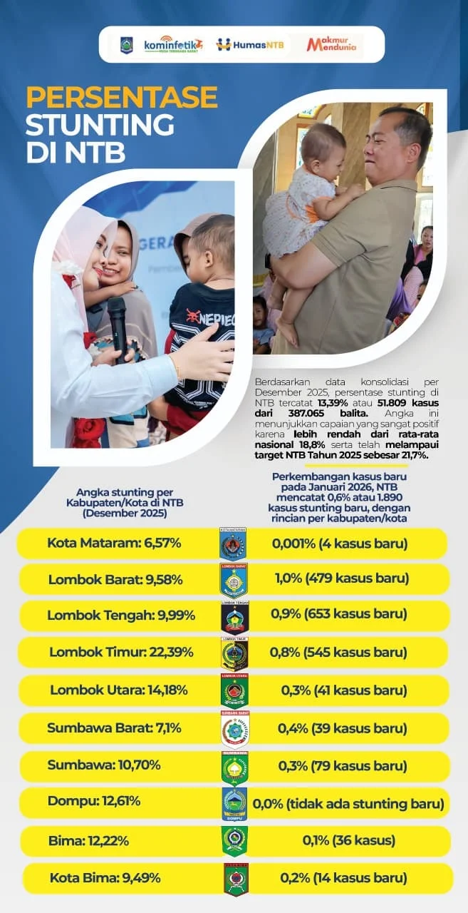 Adapun capaian penanganan stunting per Kabupaten/Kota di NTB Desember 2025 berdasarkan data laporan gizi pada aplikasi sigizikesga Kementerian RI 2026. Lombok Barat: 9,58 persen, Lombok Tengah 9,99 persen, Lombok Timur: 22,39 persen, Sumbawa: 10,70 persen, Dompu: 12,61 persen, Bima: 12,22 persen, Sumbawa Barat: 7,1 persen, Lombok Utara: 14,18 persen, Kota Mataram: 6,57 persen dan Kota Bima: 9,49 persen