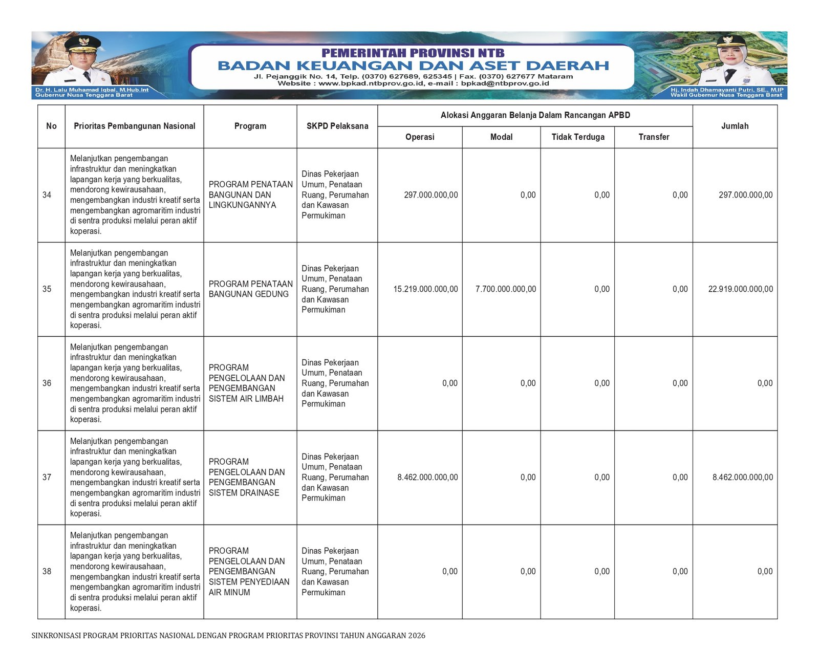 Berdasarkan dokumen sinkronisasi program prioritas nasional dan provinsi NTB, sejumlah program strategis dilaksanakan oleh Dinas Pekerjaan Umum, Penataan Ruang, Perumahan, dan Kawasan Permukiman (PUPR-PKP).